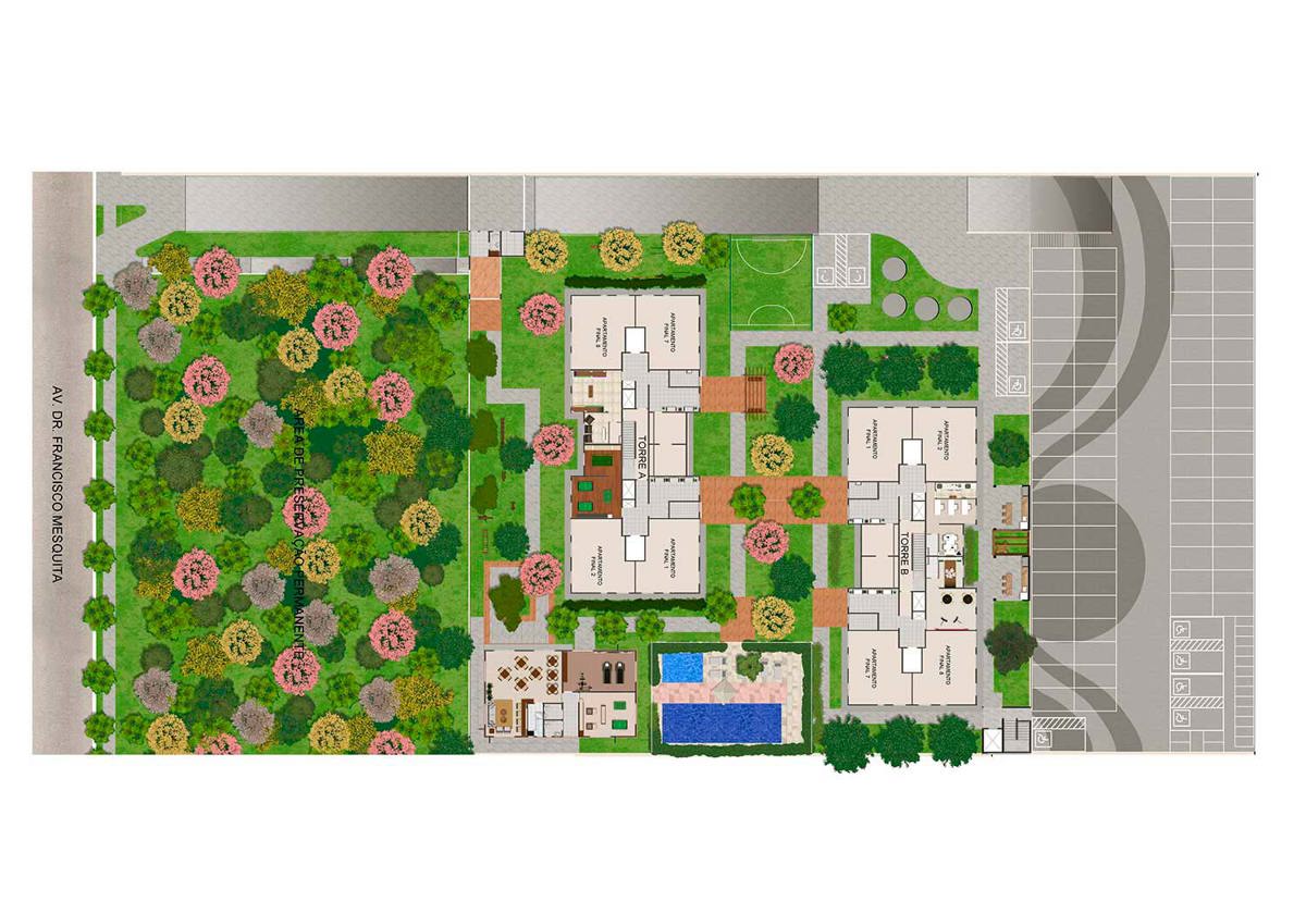 Lazer: Salão de festas / Sala de Ginástica / Sala de Jogos / Lavanderia / Office / Brinquedoteca / Playground / Praça das mamães / Churrasqueira / Mini bosque / Piscina Adulto / Piscina Infantil / Redário / Fitness Externo
